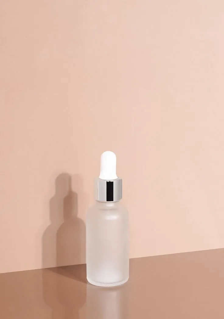 قطرهچکان حرفهای: شیشه 30 میلی لیتر مات همراه با قطره چکان سفید کروم دارای قطرهچکان سفید با پوشش کروم، امکان برداشت دقیق و آسان مایعات را فراهم میکند.